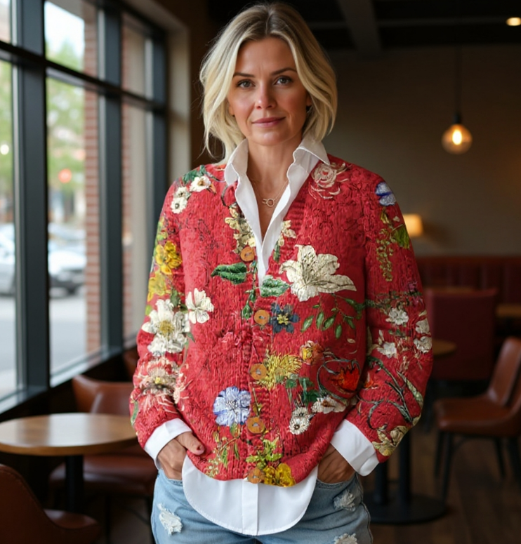 Women's Vintage Floral Art Print Buttoned Cardigan Sweater